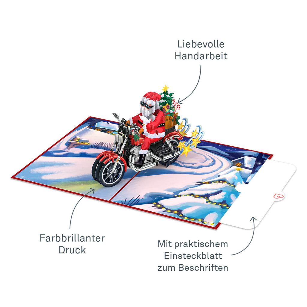 Weihnachtsmann auf Motorrad Pop-Up Karte